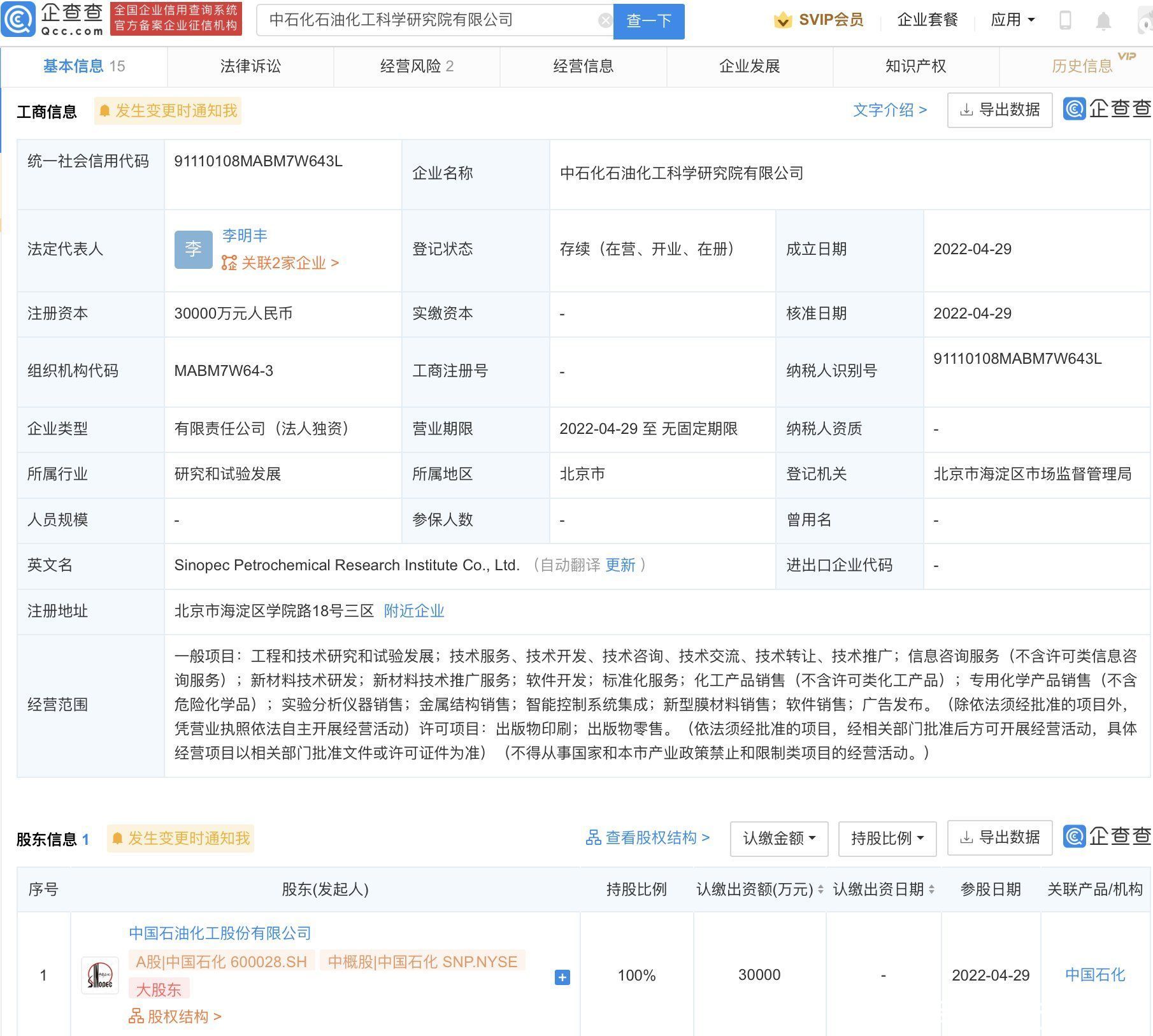 企查查APP显示,4月29日,中石化石油化工科学研究院有限公司成立,法定代表人为李明丰,注册资本3亿元人民币,经营范围包含:实验分析仪器销售;金属结构销售;智能控制系统集成;新型膜材料销售等。企查查股权穿透显示,该公司由中国石化()100%控股。